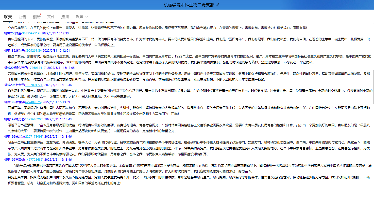 2022年5月10日,庆祝中国共产主义青年团成立100周年大会在北京举行,习近平总书记出席并发表重要讲话。为深入学习贯彻习近平总书记重要讲话精神,根据学校《关于深入学习贯彻习近平总书记在庆祝中国共产主义青年团成立100周年大会上的重要讲话精神的通知》的要求和具体安排,在学院党委的指导下,我院本科生第二党支部于5月31日下午组织召开了专题学习活动。