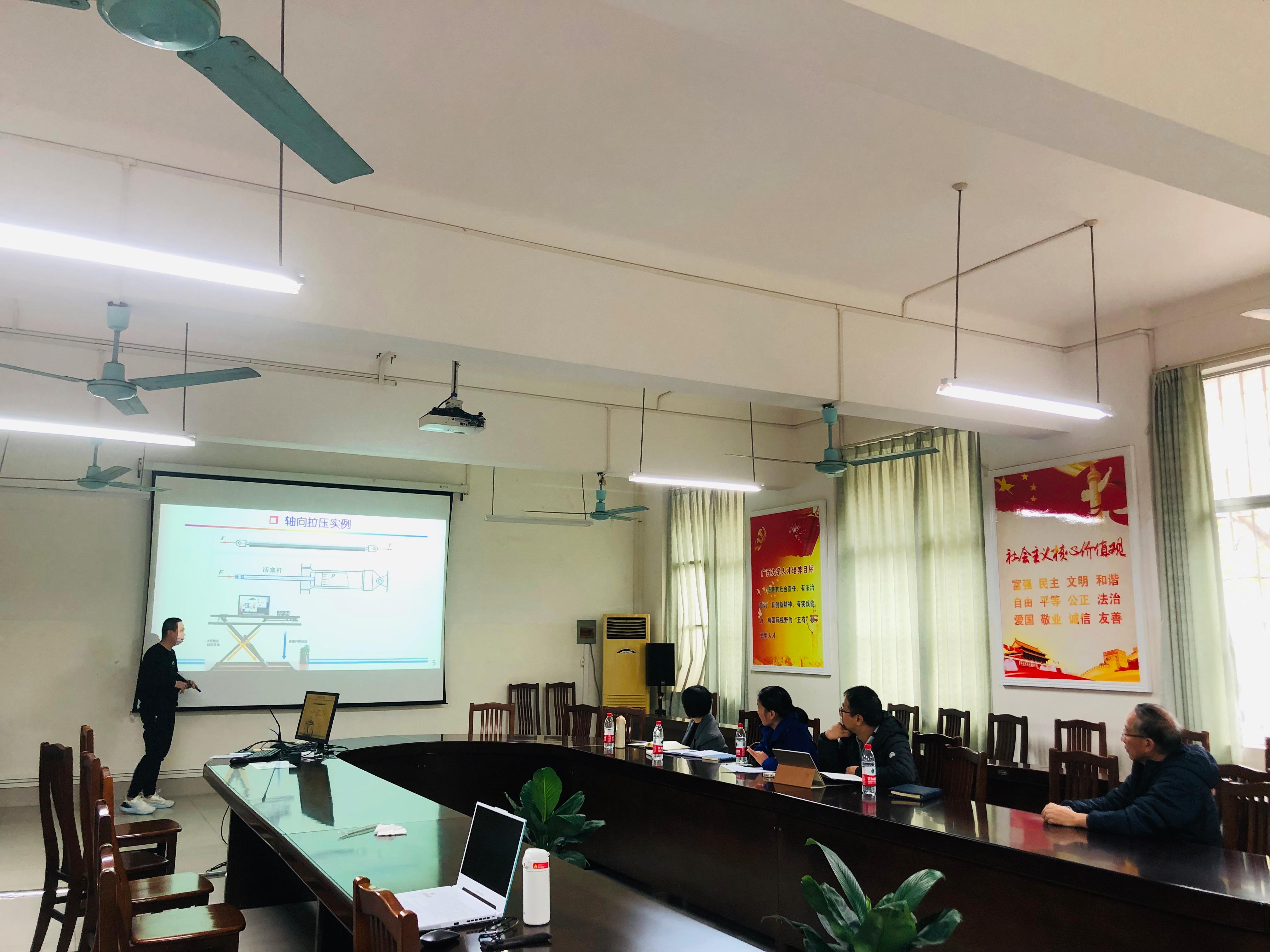 近两年新入职的项载毓、刘黎明、李琴、陆志恒、徐敏敏、盖倞尧、李宏伟、周柱坤、梁科、唐伟力、梁立喆、莫唐明、李嘉宝、董天云和魏伟等15位新教师分成3个小组,通过多媒体手段,分别试讲了《工程制图(非机类)》、《互换性与技术测量》、《工程管理与技术经济学》、《材料力学》、《工程力学(一)》、《机电传动控制》、《单片机原理及其应用》、《机械电气自动控制》、《创新设计方法与实践》、《热工学基础》、《制冷技术与原理》、《传感与检测技术》和《机械电子控制》等多门课程。