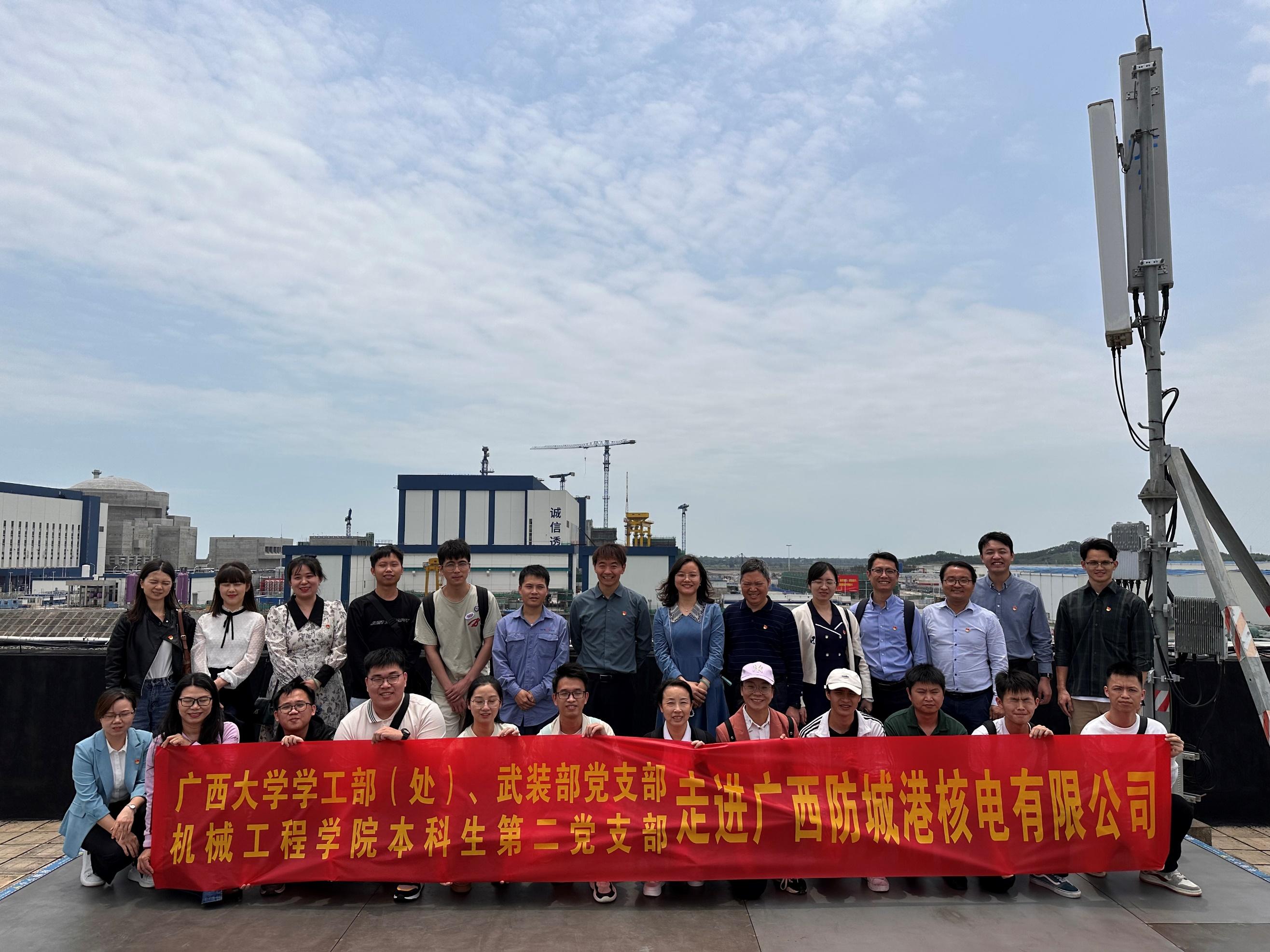 为贯彻落实党中央关于在全党大兴调查研究的工作要求,2023年4月26日,我院本科生第二党支部与学校学工部(处)、武装部党支部在学校学工部(处)、武装部王利军副部(处)长的带领下,共同赴防城港中广核广西防城港核电有限公司开展支部共建活动。