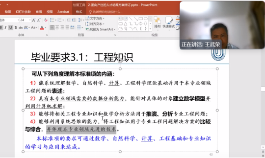 王武荣教授分别对机电,机自专业提出的两版人才培养方案遵循的标准、课程体系支撑矩阵及毕业要求评价、体制机制文件的填写与应用、课程目标评价、实践类课程评价提交的实性证据准备等问题进行了详细的指导。针对专业认证标准的2020版、2022版的变化,王教授做了清晰的解读,为人才培养方案的毕业要求观测点关键措辞适应性做出了清晰的指导,对课程评价数据收集、评价方法以及申请书的支撑材料也进行了详细的操作指导。王教授指出各专业申请材料的短板和进一步整理申请材料的要求,并表示将认真为各专业重新整理后的资料进行更详细指导和把关,为各专业组织更规范的资料提供更好的服务。
