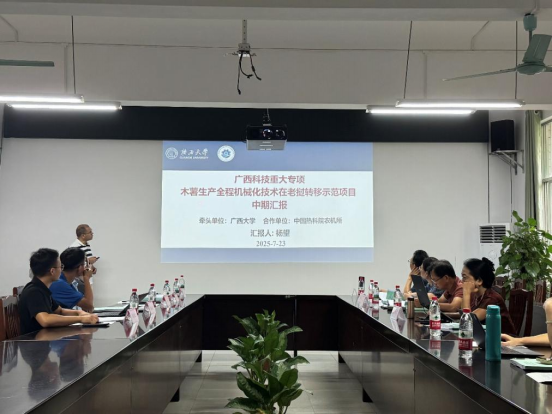 7月23日,广西科技情报学会组织专家组对我院杨望教授主持的广西科技重大专项项目“木薯生产全程机械化技术在老挝转移示范”进行中期检查和现场查定。专家组由广西农业职业技术大学二级教授黄卫萍、广西农机研究院有限公司正高级工程师莫建霖、广西农机鉴定站高级工程师卢一福等组成。项目负责人杨望教授、项目合作单位中国热科院农机所课题负责人崔振德副研究员,以及项目组主要骨干成员共7人参加会议。