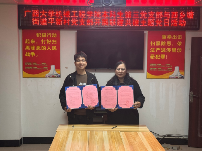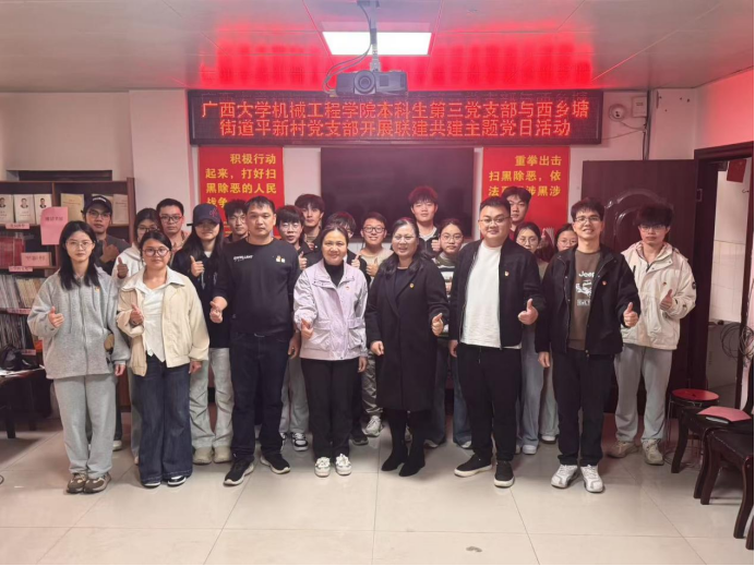 为深入学习贯彻党的二十届四中全会精神,推动校地党建资源有效整合,助力提升基层治理效能,2026年1月16日,我院本科生第三党支部与西乡塘街道平新村党支部开展党建联建共建活动。双方党支部以理论联学、组织联建、服务联动为主线,通过联合开展“携手共建聚合力,青年砺行助振兴”主题党日,共同为基层治理与乡村振兴注入青春活力。学院党委副书记黄路明、本科生第三党支部书记李华,平新村党支部书记李艳丽、平新村副主任卢尚贵等双方党员参加交流活动。