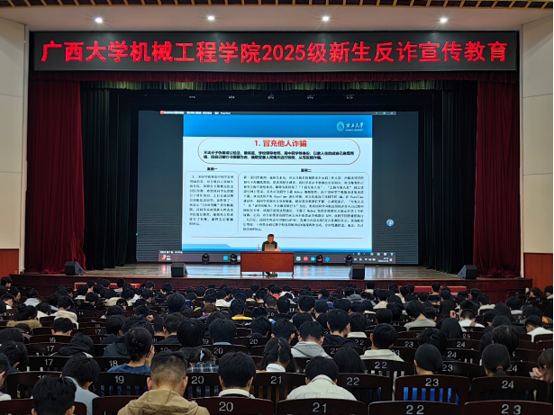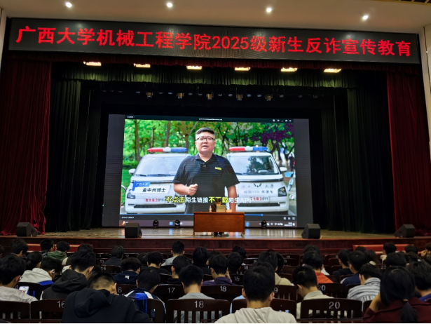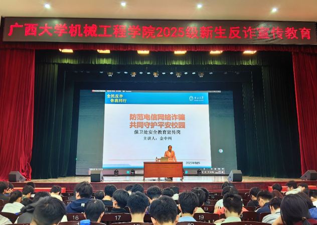 为增强学生识骗防诈能力,筑牢校园安全防线,我学院于2025年12月14日晚在学校大礼堂举办2025级新生“防范电信网络诈骗”主题培训会。本次培训会由学院党委副书记黄路明主持,广西大学保卫处金中州老师主讲。