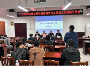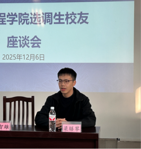 12月6日下午,我院在机械楼报告厅举办选调生校友基层工作经验分享会。本次分享会邀请到我院2019届校友赵智雄、2025届校友廖家强和梁膳攀三位选调生代表返校,为在校生传经送宝。院党委副书记黄路明、负责就业工作辅导员曾祥喜及在校学生代表参加座谈交流。