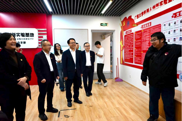 报告会结束后,与会嘉宾一同参观位于大学生活动中心的广西大学ROBOT-Z机器人创新实验室,近距离感受实验室的大学生们对科技创新的热情与活力。