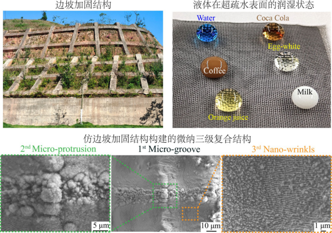 论文的第一作者为我院助理教授刘黎明,通讯作者为尤晖教授,广西大学是论文的第一署名单位。该论文受山体“边坡加固”结构的(如图1所示)启发,在金属表面构建了具有超疏水润湿特性的三级尺度微纳金属网膜结构,进而开发出一种机械强度大、耐久性强的新型超疏水多孔膜基材料,成功突破了上述技术瓶颈。实验表明,这种材料的超疏水微纳结构具有类荷叶的自清洁功能,可抵抗生活中常见的液体如水、可乐、咖啡、鸡蛋清液、果汁和牛奶等的润湿,具有优异的防污能力。更重要的是,面对水射流冲击,2000次循环摩擦,400℃高温处理以及1.6吨汽车碾压等严苛机械测试后,仍具有自清洁能力。此外,该超疏水金属网膜具有油相/水相选择超浸润特性,可自动“识别”油相或水相选择性通过(如图2所示)。这种材料表面的高强度三级微纳结构有望克服油水分离技术中,由于液体高速冲击而导致涂层与基底脱离的缺点,在自清洁和油水分离应用领域具有重大应用价值。