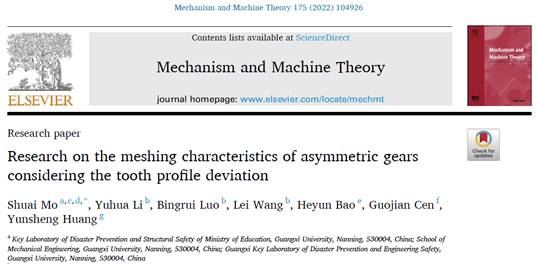 莫帅教授团队在顶级期刊国际机构学与机器科学联合会(IFToMM)会刊《Mechanism and Machine Theory》(双一区,TOP期刊)上发表研究成果“Research on the meshing characteristics of asymmetric gears considering the tooth profile deviation”。该成果以广西大学工程防灾与结构安全教育部重点实验室为第一单位及通讯单位,莫帅教授为第一作者兼通讯作者。