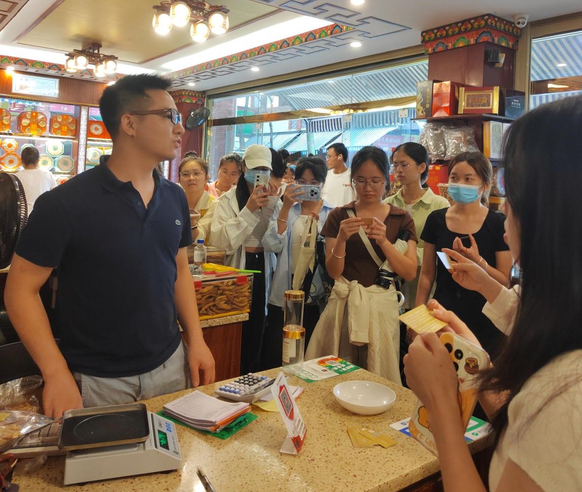 活动开始,由蒙绍祥老师带领同学们一同前往黄氏冬虫夏草商行参观学习,与商行黄店长围绕企业经营情况、经营类型以及营销模式等方面进行展开交流,深入了解中药材销售品种、价格、销售情况。除此之外,与店长一起探讨店铺转型电商事宜,店长表述目前中药行业的经营困境,暂不考虑转型电商。会上,同学们认真聆听,做好笔记。最后,班主任蒙绍祥老师带领同学们走进中药港市场进行调研学习,共走访了售卖中药、灵芝、香料等店铺,进一步巩固同学们对中药市场了解。