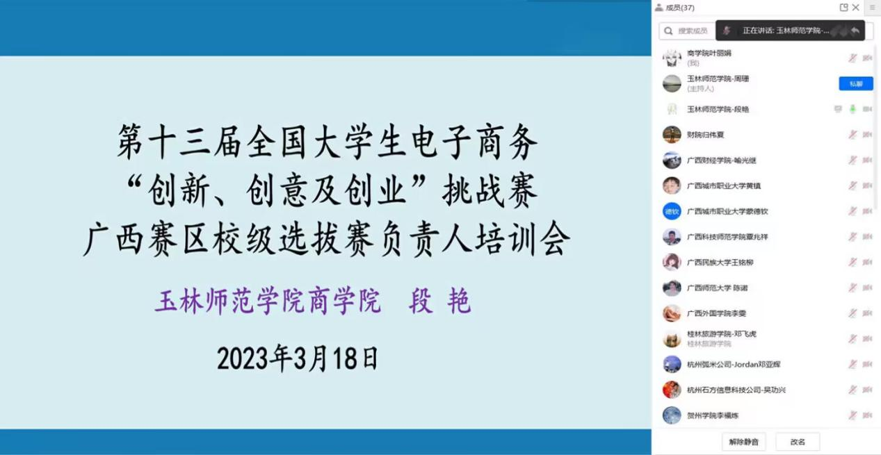 3月18日,伟德国际1946手机开展第十三届全国大学生电子商务“创新、创意及创业”挑战赛广西校区选拔赛负责人培训线上会议。广西本科高校电子商务及物流类教学指导委员会秘书长、广西财经学院喻光继教授、杭州弧米科技公司邓亚辉、杭州石方信息科技公司吴功兴、bv伟德国际1946院长许进杰、三创赛竞组委秘书李磊、以及广西赛区各院校三创赛负责人参加此次会议。会议由bv伟德国际1946副院长段艳主持。