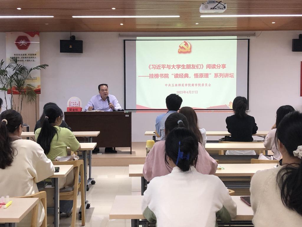 4月27日,bv伟德国际1946于我校东校区梅园挂榜书院举行“读经典,悟原理”系列讲坛之《习近平与大学生朋友们》读书分享会,bv伟德国际1946学生干部代表参加此次活动。此次活动由bv伟德国际1946党委书记管金标主讲。