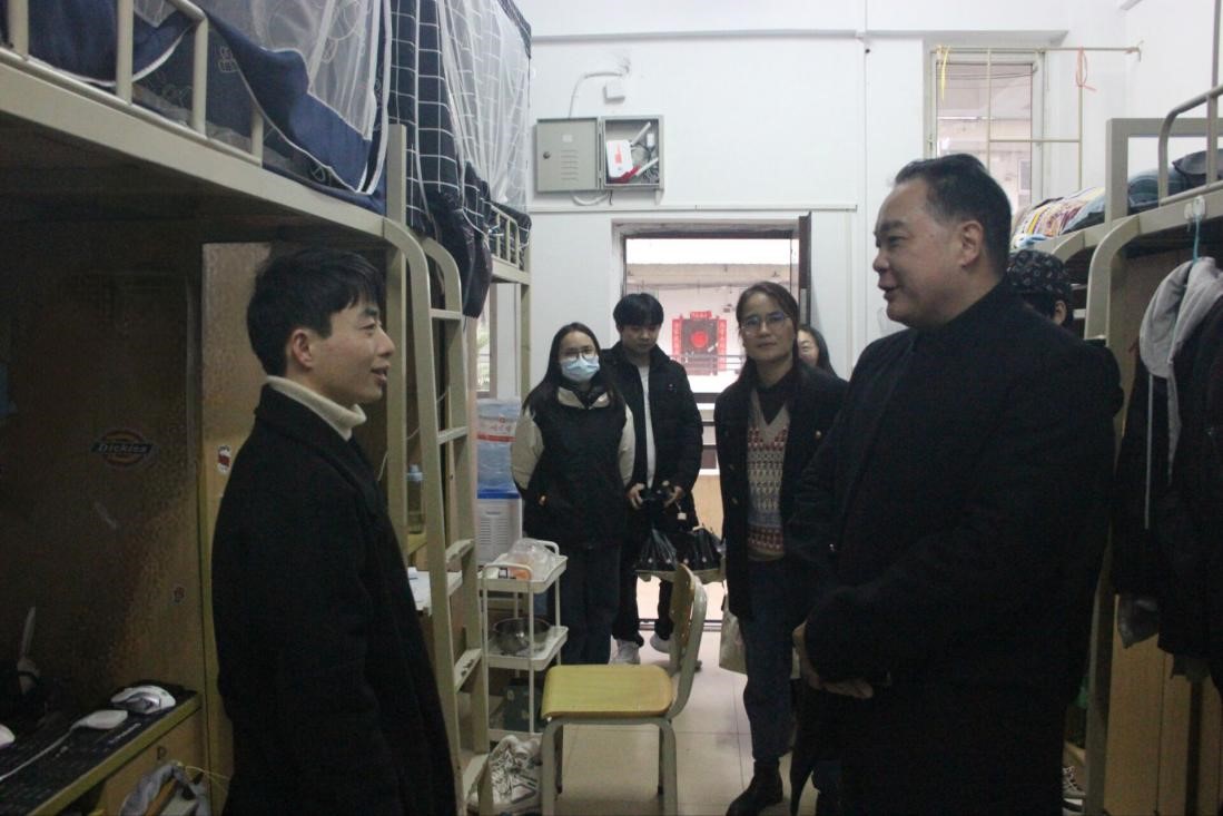 此次走访着重了解学生的思想状况、宿舍安全隐患排查、学生日常生活情况等方面。管金标与学生亲切交谈,了解学生的思想状况,排查宿舍存在的一些安全隐患问题并提出整改意见,强调学生要严格遵守学校各项纪律,注意用水用电安全,谨防网络诈骗、注重人身财产安全。他叮嘱学生要做好新学期学习计划,有效将学习和生活平衡起来,加强日常锻炼,调整作息习惯,以最佳状态迎接新学期的学习。