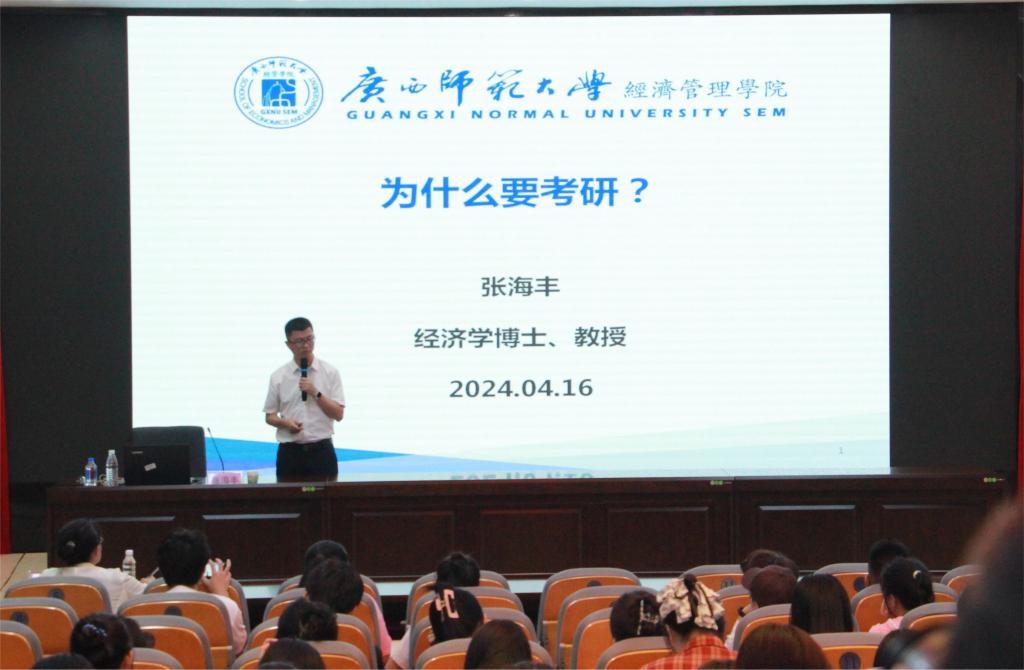 4月16日晚,张海丰教授为该院师生开展了一场题为《为什么要考研?》的考研指导讲座,张教授就当前的考研形势、经济管理类专业学生考研选择、广西师范大学经济管理学院培养特色等方面进行了分享,现场解答了同学们关于学硕与专硕的区别、复试试题技巧解答、近几年岗位的录取分数线等问题,内容具体,数据翔实,现场气氛活跃,受到同学们欢迎。
